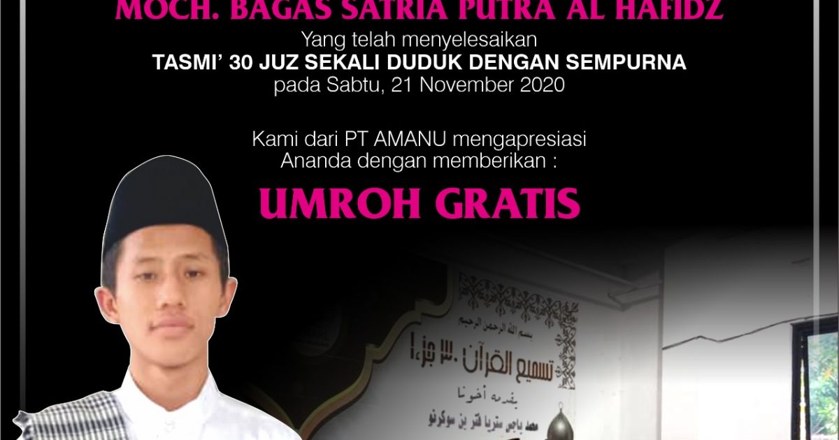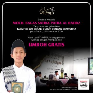 Kemudian di awal bulan Desember 2020 ini, pemilik PT Amanu (perusahaan biro jasa haji dan umroh) Ibu Nunung membaca informasi tentang ananda Moch Bagas yang telah tasmi 30 juz sekali duduk tanpa kesalahan. Ibu Nunung kemudian menyampaikan akan memberikan hadiah umroh kepada ananda Moch Bagas.
